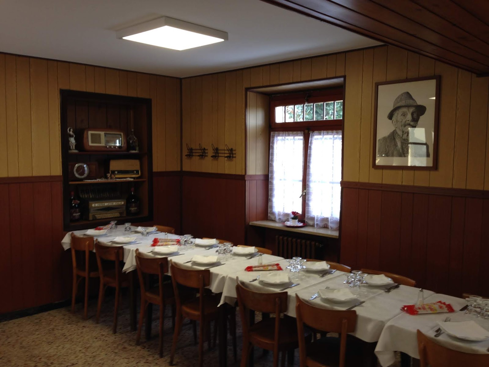 Giro classico di antipasti composto da lingua al verde, peperoncino ripieno, salame, lonza e vitello tonnato. Fra i primi agnolotti in vari gusti (ragu, burro o pomodoro) trofie al pesto per l’occasione o risotti…gustosa salsiccia al sugo, ottimo agnello al forno o scaloppine al mandarino…Vino sfuso in caraffe e qualche bottiglia.