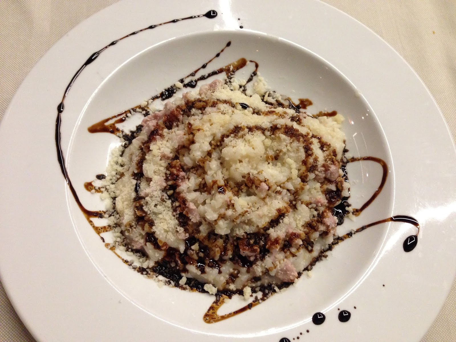 Iniziale stria gonfia con pancetta (una sorta di coreografico calzone o sufflè fatto con l’impasto della pizza…) un’eccezionale riso vialone nano (da lui personalmente curato e scelto) con salsiccia, aceto balsamico stravecchio e grana, medaglione di filetto al balsamico con patate saltate al rosmarino da cucina pluridecorata..dessert home made, in vista, nella mostra e alcol in fundo con un imperdibile nocino artigianale.