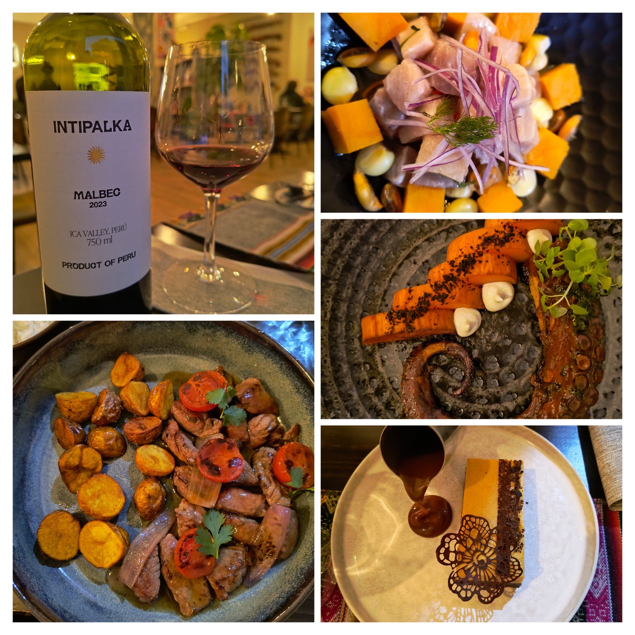 Spiccano quindi dei piacevolissimi Chevice (piatto nazionale prevalentemente a base di pesce marinato e verdure), carni pregiate accompagnate da prodotti ortofrutticoli peruviani, menzione speciale al polpo laccato, con patate dolci e polvere di olive del Perù. Squisito il dessert El Dorado a base di Lucuma (frutto tipico utilizzato per dolci e gelati)